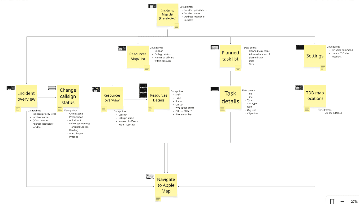 This images below are my initial approach post user journey maps, because we want police officers to respond to jobs quickly I have a preselected incident screen with the list on the map. I’ve made the User Flow of what it will look like in Miro.