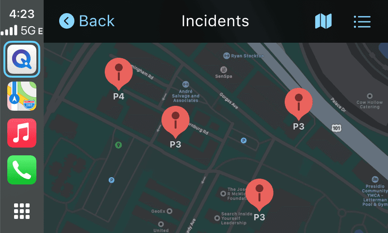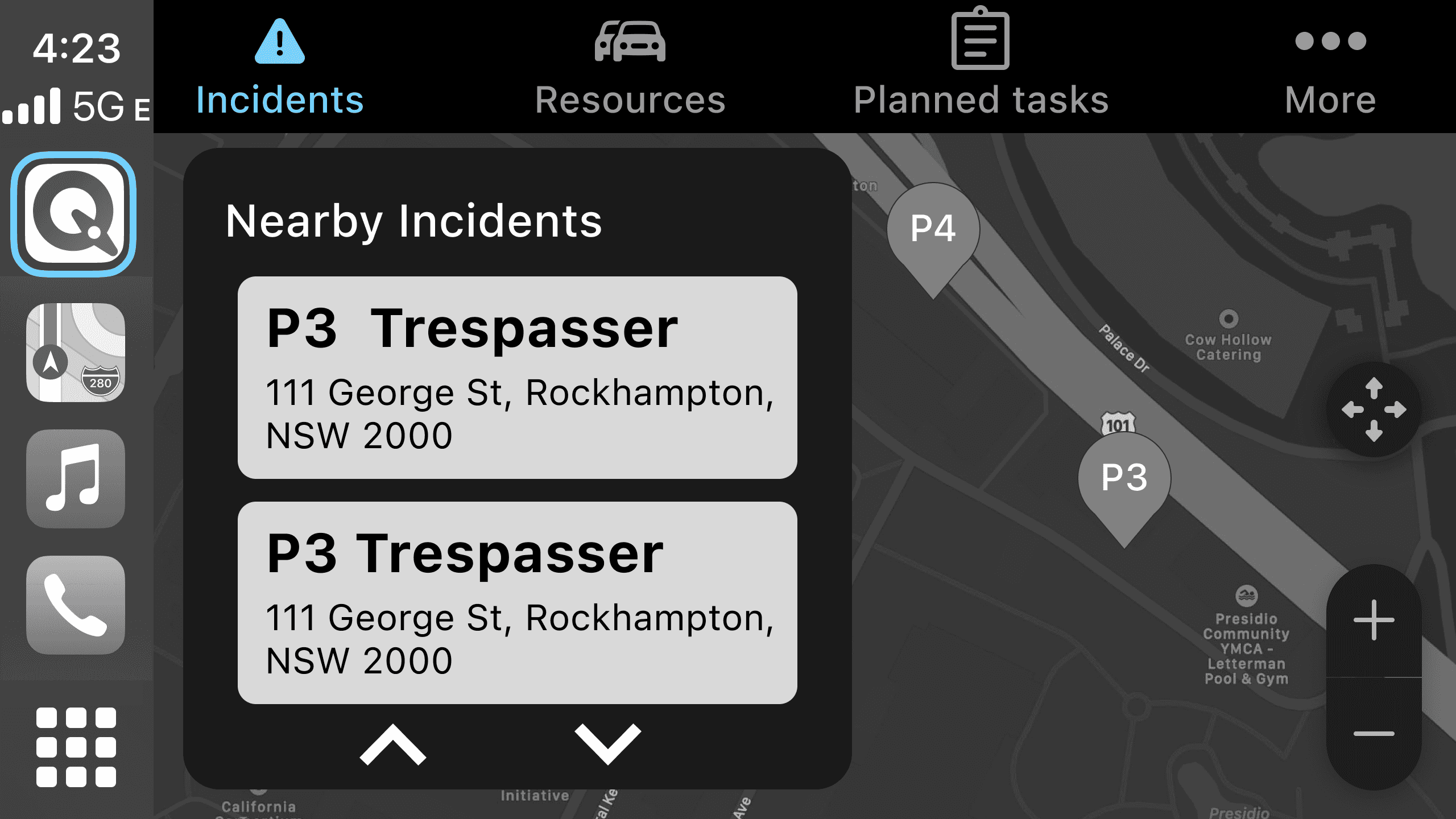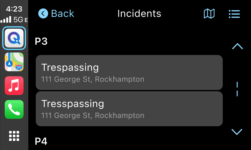 If they click on Incidents they can switch between map view or list view, on map pins the information we can put is quite limited, we only use P1 - P4 to help officers make a decision on which one to tap. P1 - P4 are the priority on how severe an incident is, 1 is the highest 4 is the lowest. List view is more useful because we can see what type of incident it is and also the location.