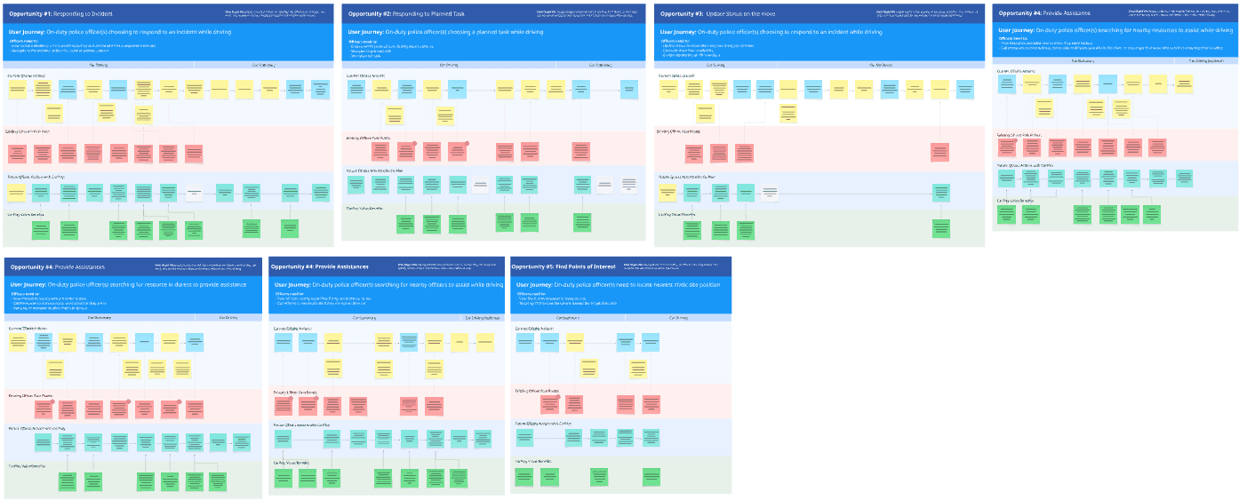 Here are the values/benefits that we’ve put in the journey map after studying what is the day in the life of a police officer within the workshop. There are different types of officers such as “First responders” “Dog squads” “Bike units” “Supporting units” and many more but the journey maps we are showing the most common scenarios which applies to all proto-personas in general. We have made 7 journeys based on the scenarios police will encounter within their daily duties: